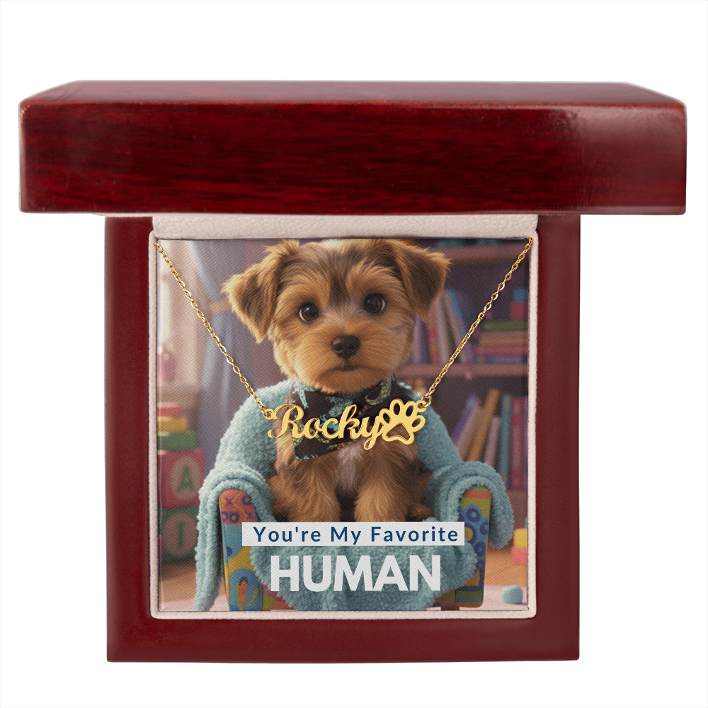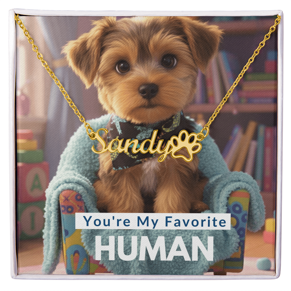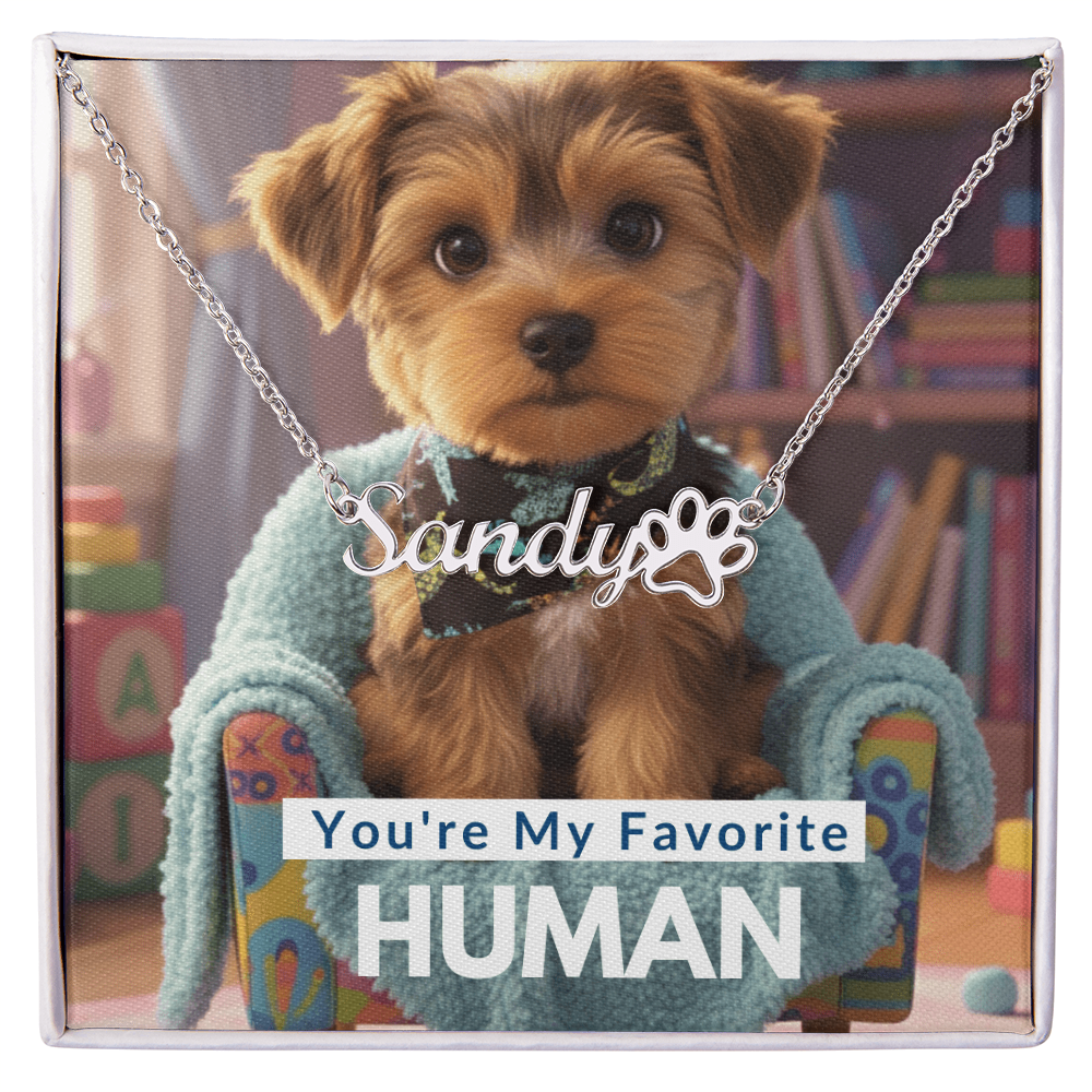 This stylish necklace features a cursive name design and paw print symbol suspended on a 16”-18” adjustable cable chain, making it both personal and beautiful! Your necklace will be custom made upon ordering in the name or word of your choice, with up to 11 characters.  It's a gift they will surely want to keep close to their heart forever!